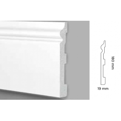 Battiscopa zoccolino in legno massello alto mm180 sagomato ducale tipo all'inglese, grazie alla superficie grezza è ottimo per una finitura a piacere, sopra l'altezza di mm140 le nostre macchine di verniciatura non riescono a laccare, per questo lo forniamo grezzo.