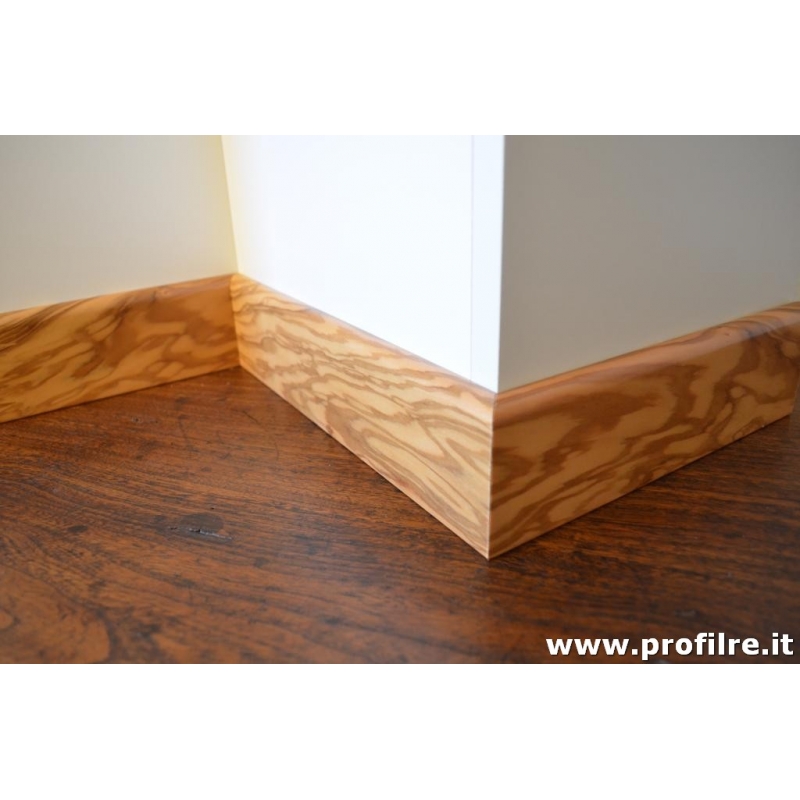 Battiscopa zoccolino in vero legno impiallacciato essenza Ulivo altezza 8 cm con spessore mm 13.
