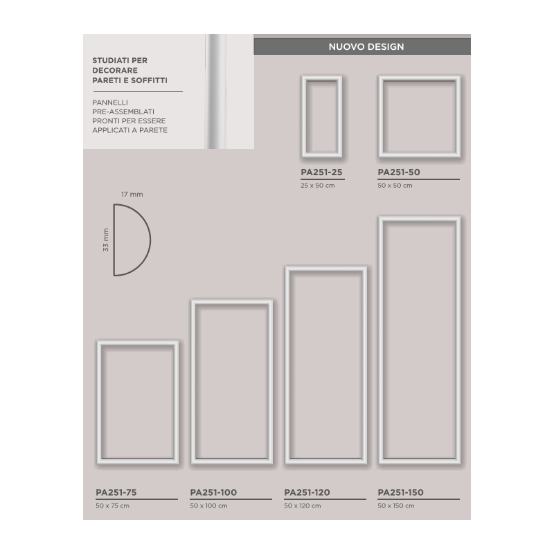 | Consigli per la posa: | Verniciabile con smalti di ultima generazione. Tagliere le cornici manualmente o con macchina elettrica, incollare i profili su parete e soffitto inserendo il collante sul retro. |